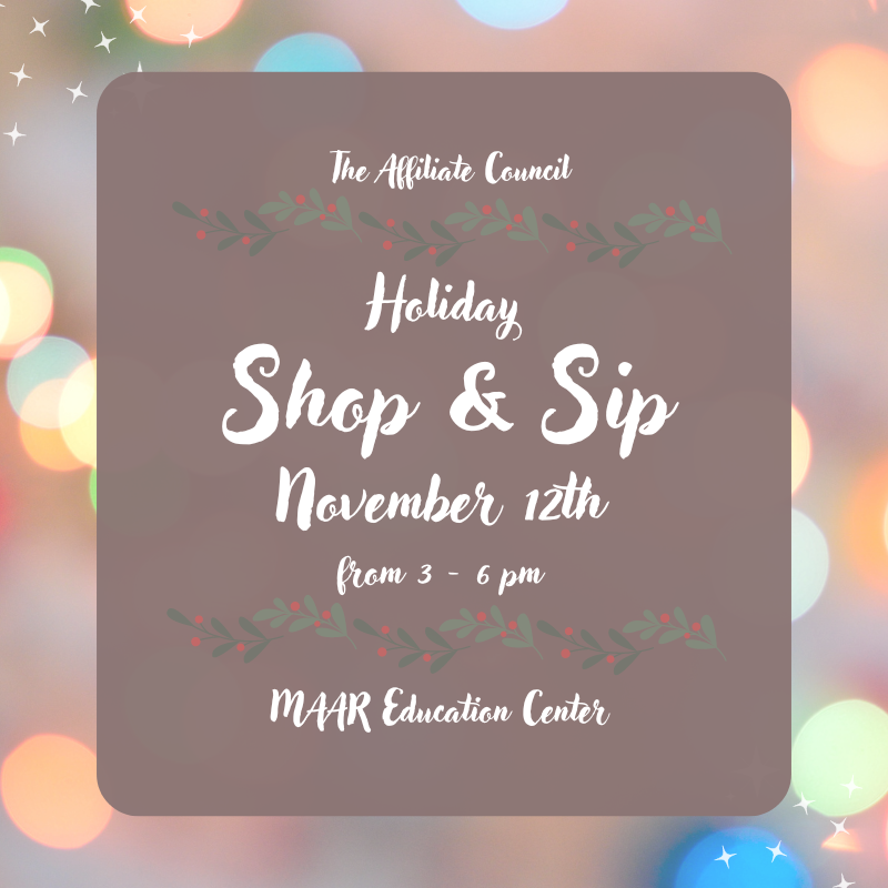 December is coming and so is the holiday shopping season! The MAAR Affiliate Council invites you to its Holiday Shop & Sip, a holiday pop-up shop event here at MAAR! The Holiday Shop & Sip will feature local vendors selling unique, hand-crafted items, clothing, jewelry, home decor, art, accessories and more. Along with shopping, attendees can partake in holiday beverages, appetizers, door prizes and lots of merriment. Come on out November 12th to get ahead of the holiday season and grab some gifts for the people on your gift list. All are welcome – just bring your holiday spirit!