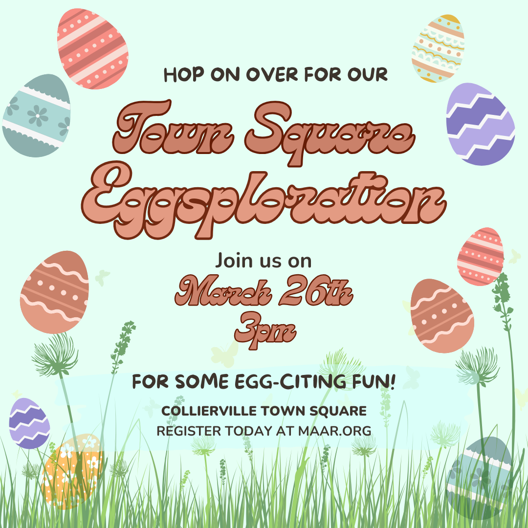 Join us for an Easter egg hunt! Please meet at the Collierville Town Square at 3 p.m. and head to John Green & Co., REALTORS® to grab an Easter basket. We'll hunt for eggs on the Square from 3:30-4 p.m. and have a scavenger hunt from 4-4:30 p.m. Immediately following, we'll move to David Grisanti's on Main for private dining.